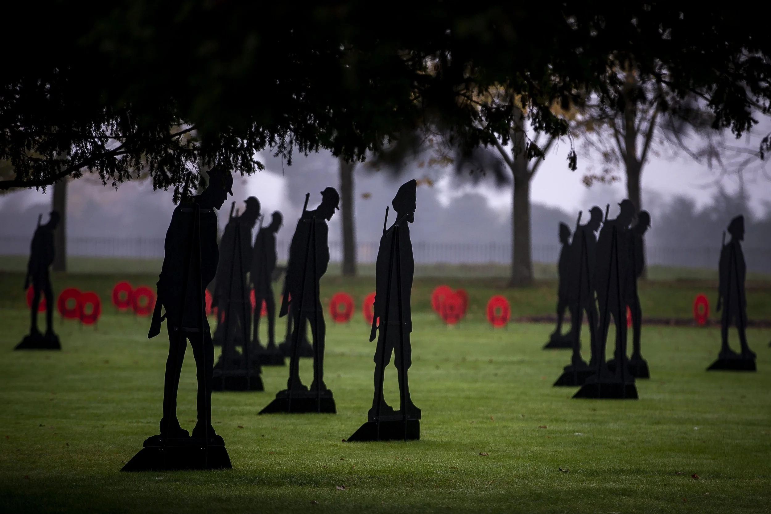 The 2021 & 2022 installations feature 100 near-life-size soldier silhouettes, displayed alongside 79 screen-printed poppy wreaths, creating a poignant display.