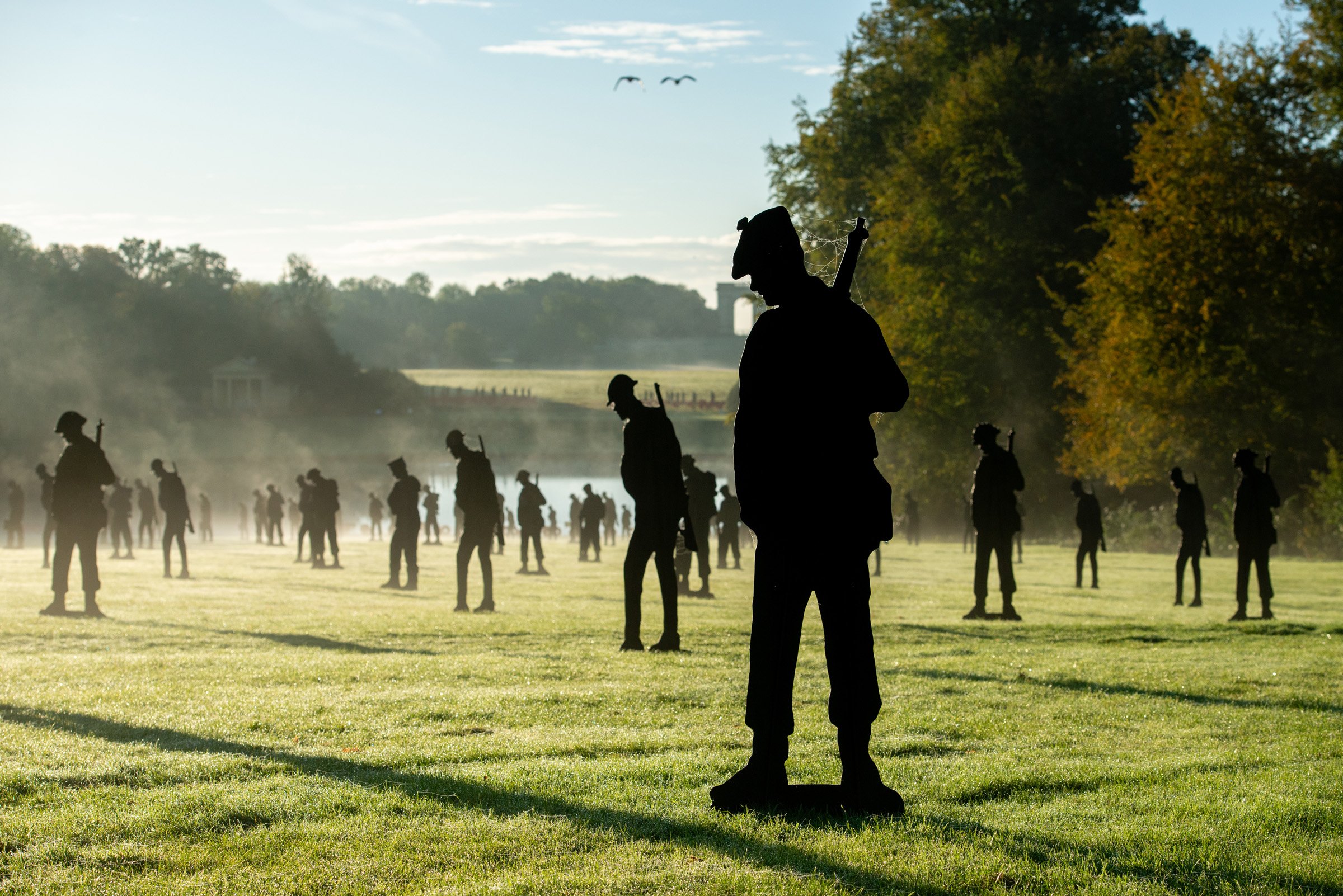 From October 2023 to January 7th, 2024, 200 of the 1,475 life-size D-Day soldier silhouettes were showcased within the natural landscape surrounding Octagon Lake and Sleeping Wood in the scenic National Trust gardens at Stowe. Starting on October 1st, 2024, and running through November 11th, 2024, the full installation, titled "For Your Tomorrow" and previously displayed at the British Normandy Memorial in Ver-sur-Mer, France, will be on view, featuring all 1,475 D-Day silhouettes.