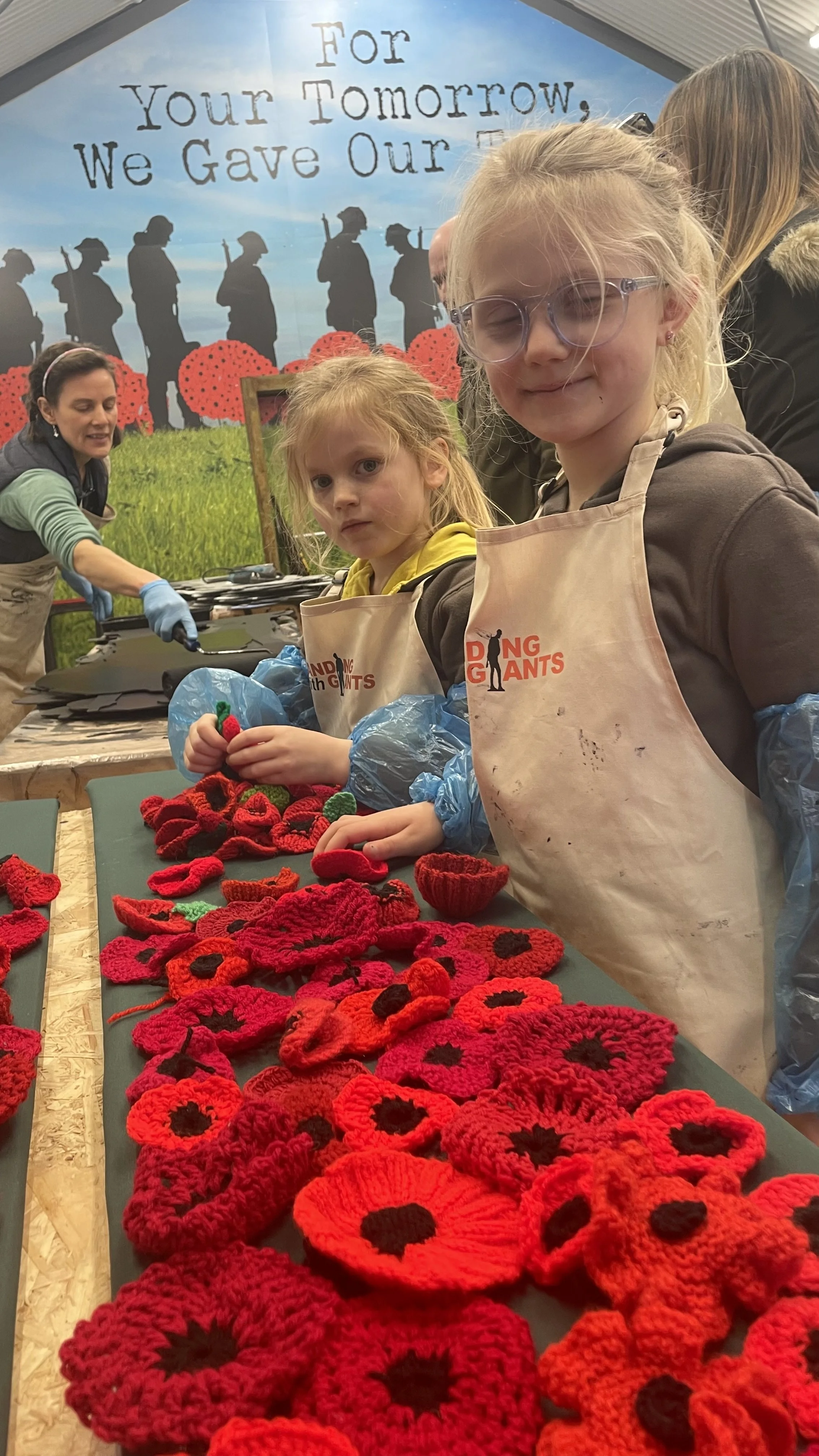 Standing with Giants enlisted the help of The WI (National Federation of Women's Institutes). A long term friend of Standing with Giants and Secretary of Apple Blossoms WI, Kingston Bagpuize, Toni Briggs, took on the task to encourage her fellow WI colleagues to start knitting and crocheting poppies so Standing with Giants could attach them to the base plinths of our packing stillages/crates transported our soldier silhouettes to Normandy and beyond for future installations. WI colleagues up and down the country knitted and crocheted the poppies needed and sent them to Toni who countied and recorded each one received.